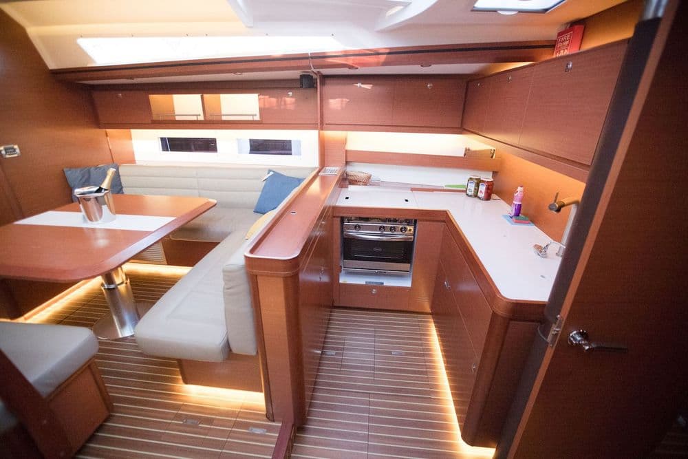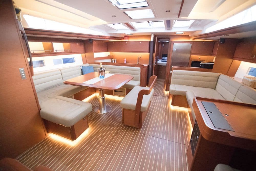 Designed for comfort and performance, the Dufour 56 is an elegant, modern 17-metre sailing yacht. On board, it has a well-equipped galley and living area plus four generously sized cabins with double beds. There is plenty of storage space too, including a wine cellar!