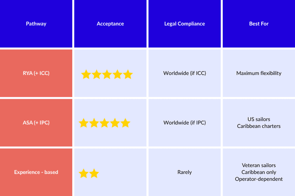 Why choose this: Very charter-focused. Widely accepted in the Caribbean and by US-based operators. If you're planning to sail primarily in the Americas, this is your most efficient route.